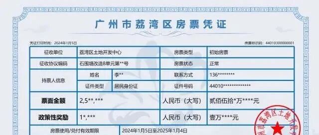 荔湾区土地开发中心以石围塘项目为试点,率先落地全市第一批“房票安置”。今日已发放的房票凭证载明了房票类型、购房地址、票面金额、政策性奖励金额、使用/兑付期限等信息,可由本人或其直系亲属购买“定点入库”的新建商品房源,据了解,目前,荔湾发展集团、中海集团、珠江实业、力诚投资公司已纳入“定点入库”名录。