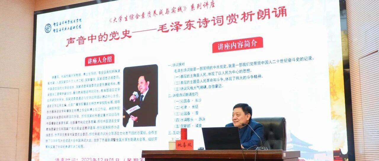 12月1日下午,校党委理论学习中心组走进智慧海洋科学技术学院《大学生综合素质养成与实践》课程系列讲坛,观摩学习由教育部语言文字应用管理司原司长姚喜双教授主讲的《声音中的党史——毛泽东诗词赏析朗诵》。